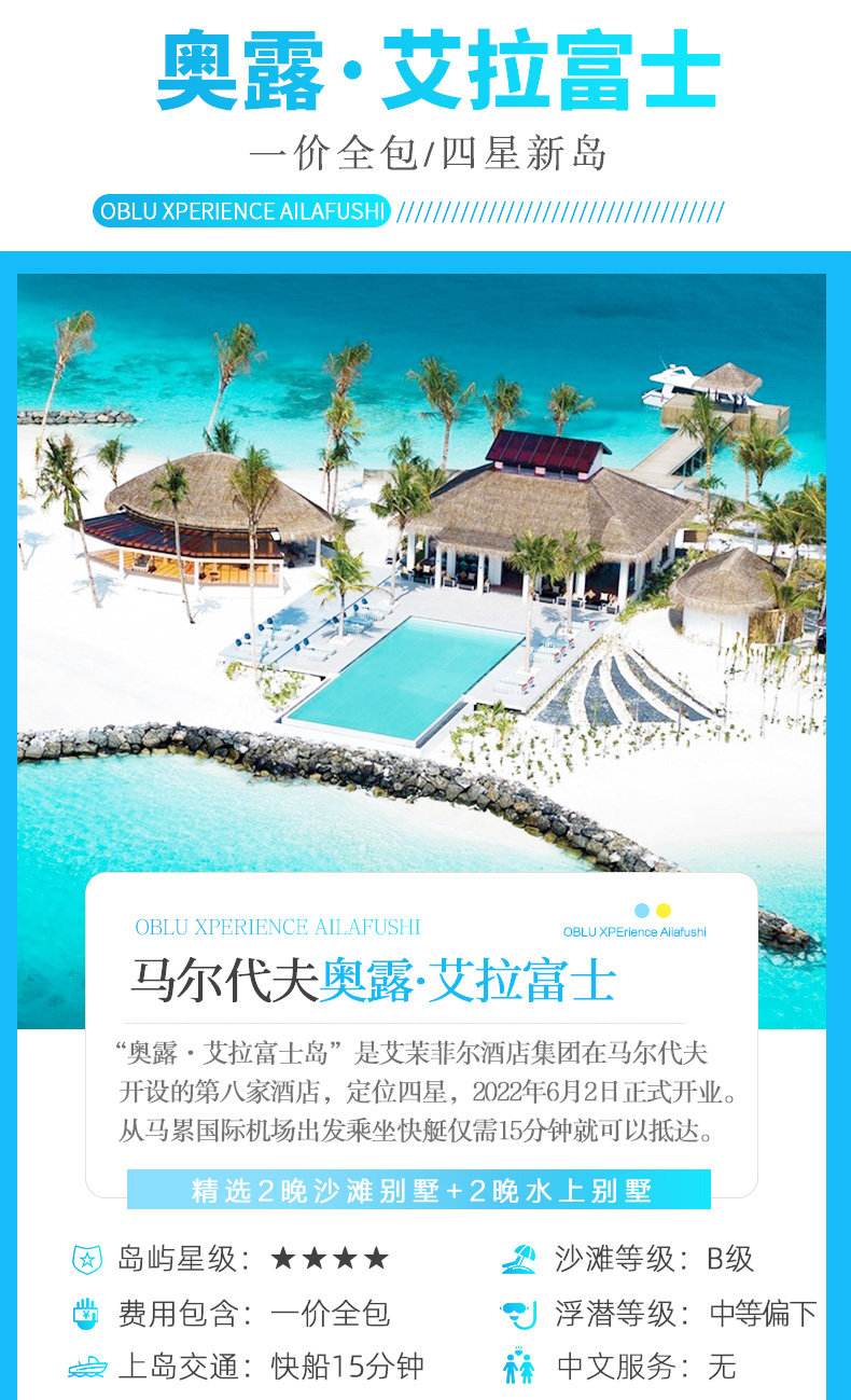 【北京直飞马尔代夫】奥露艾拉富士岛2沙2水6-7日游【一价全包+快艇上岛+4星小岛+儿童天堂+多种娱乐活动】 如当地停留五晚送一晚马累住宿
