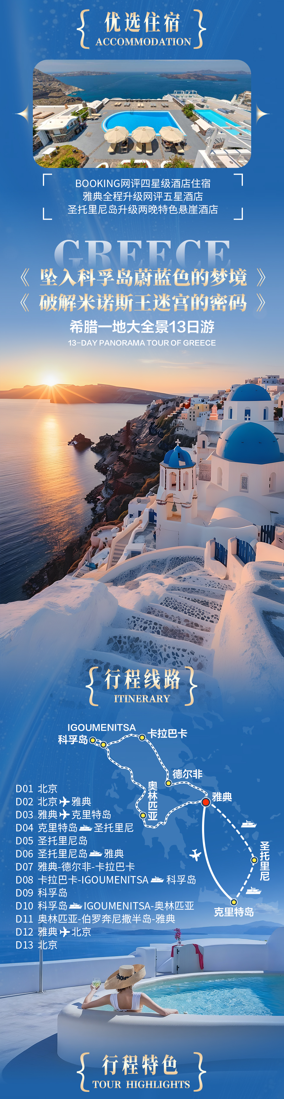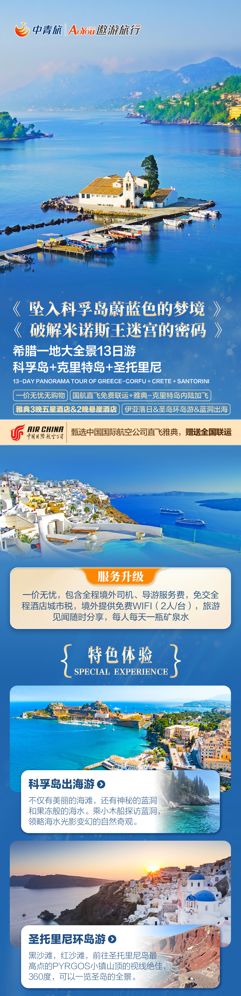 【悦游欧洲】希腊一地大全景13日游【克里特岛+圣托里尼/奥林匹亚+德尔菲梅黛奥拉+伯罗奔尼撒/E线深度:米克诺斯+扎进索斯】 国航直飞/四星+悬崖酒店+雅典全程5星/8菜+6大美食/内陆加飞/F线科孚岛