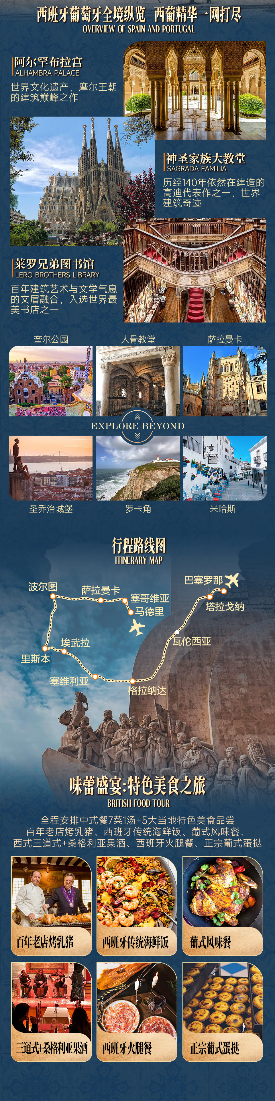 行程东西贯穿葡萄牙与西班牙,两国三大首府城市——里斯本、马德里、巴塞罗那;以及安达卢西亚首府塞维利亚、历史名城格拉纳达、瓦伦西亚等必访名城,12天尽揽伊比利亚半岛的多元魅力。