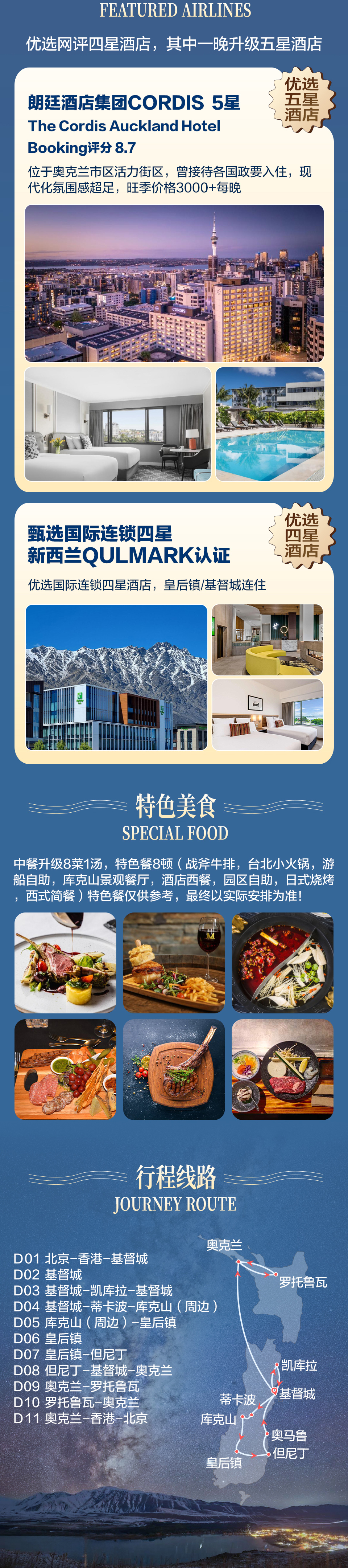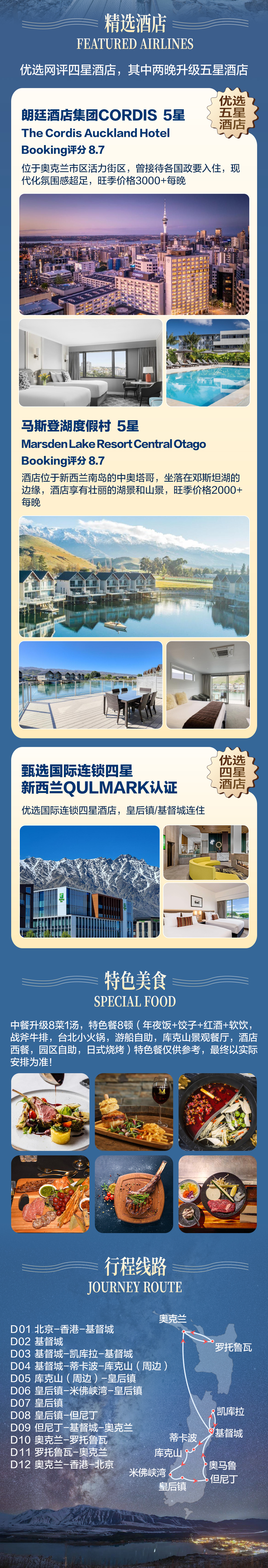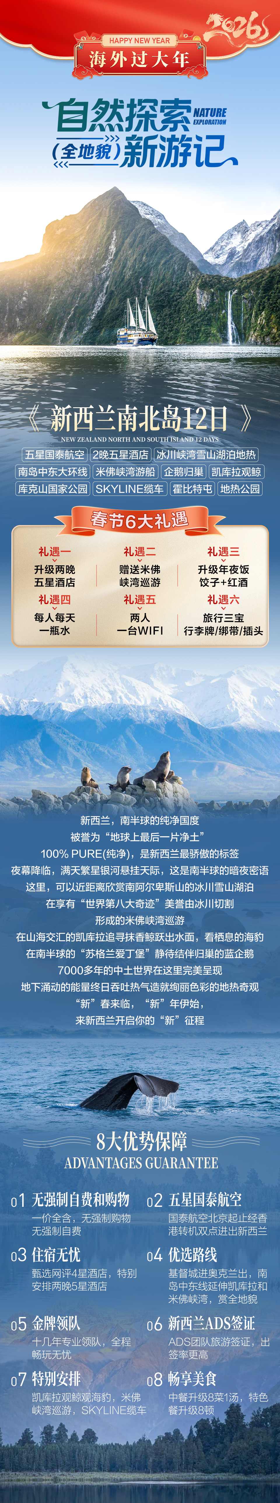 一: 升级两晚五星酒店;二 : 赠送米佛峡湾巡游; 三:升级年夜饭(饺子+红酒+软饮);四:每人每天一瓶水;五:两人一台WIFI ;六:旅行三宝(行李牌/绑带/转换插头)