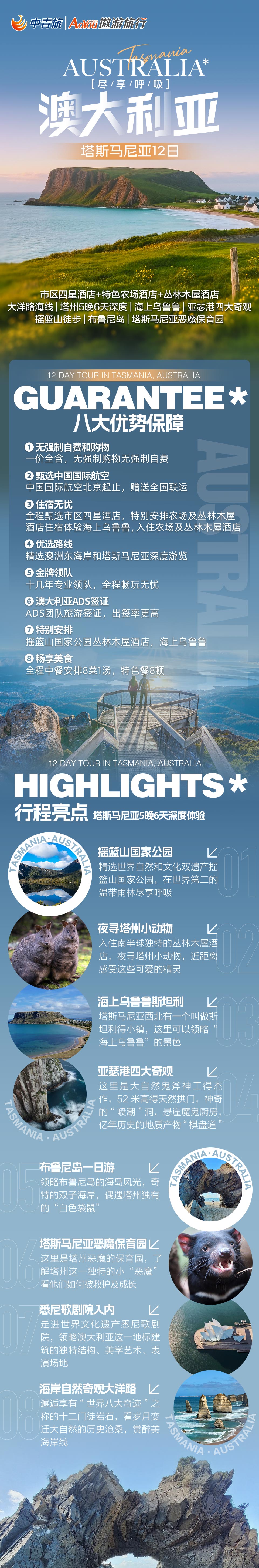 【尽享呼吸】澳大利亚塔斯马尼亚12-13日游【畅游三大州+塔斯马尼亚+悉尼+墨尔本】 一价全含,国航直飞,丛林木屋酒店,农场酒店,四星酒店,中文领队