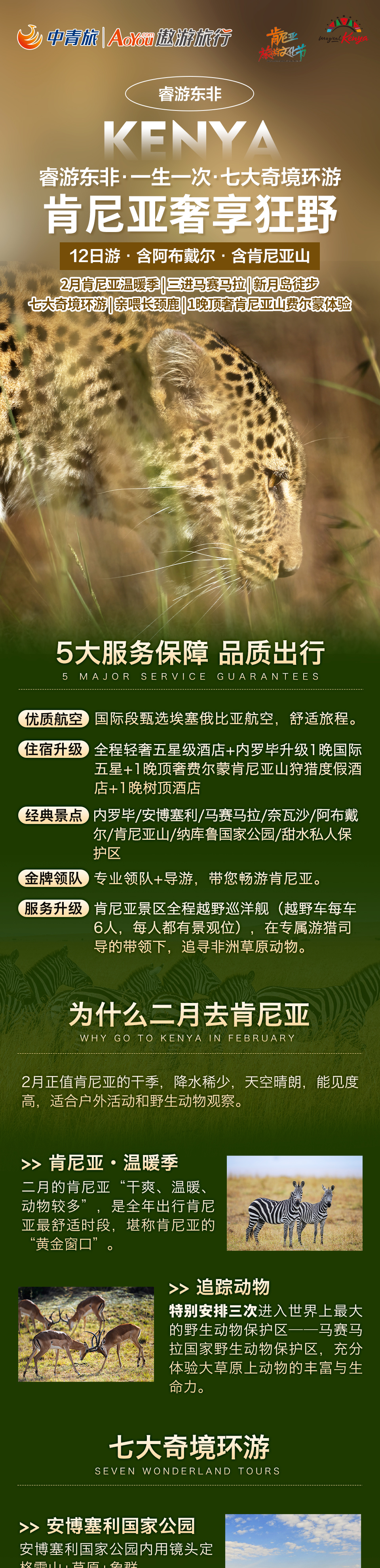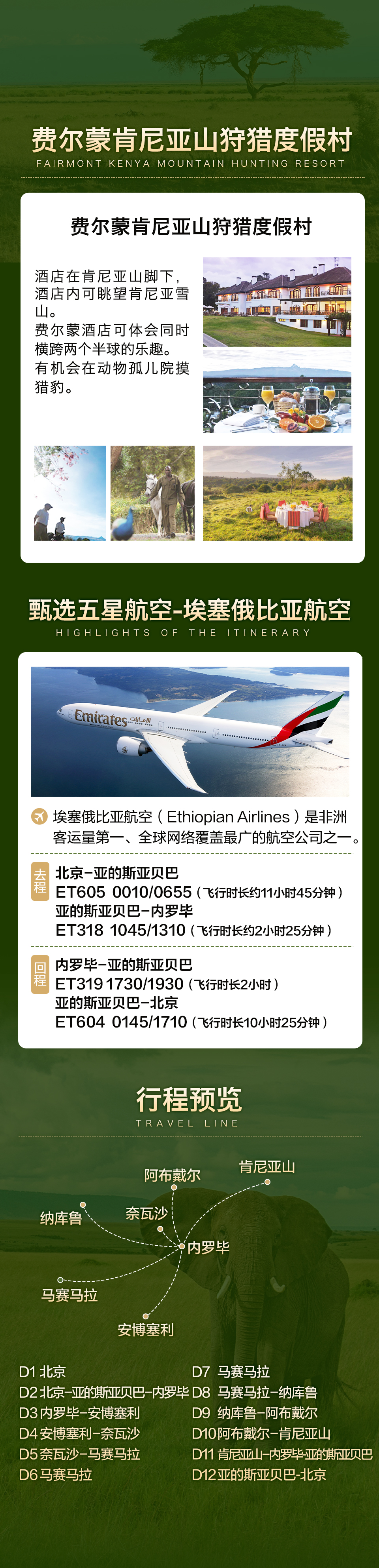 安博塞利用镜头定格“雪山+草原+象群”;马赛马拉草原:追踪非洲五霸,捕捉猎豹冲刺惊险瞬间,邂逅百鸟齐飞壮美画卷。奈瓦莎湖跳脱出草原的狂野,聆听鸟类弹奏出肯尼亚最优雅的生态乐章。