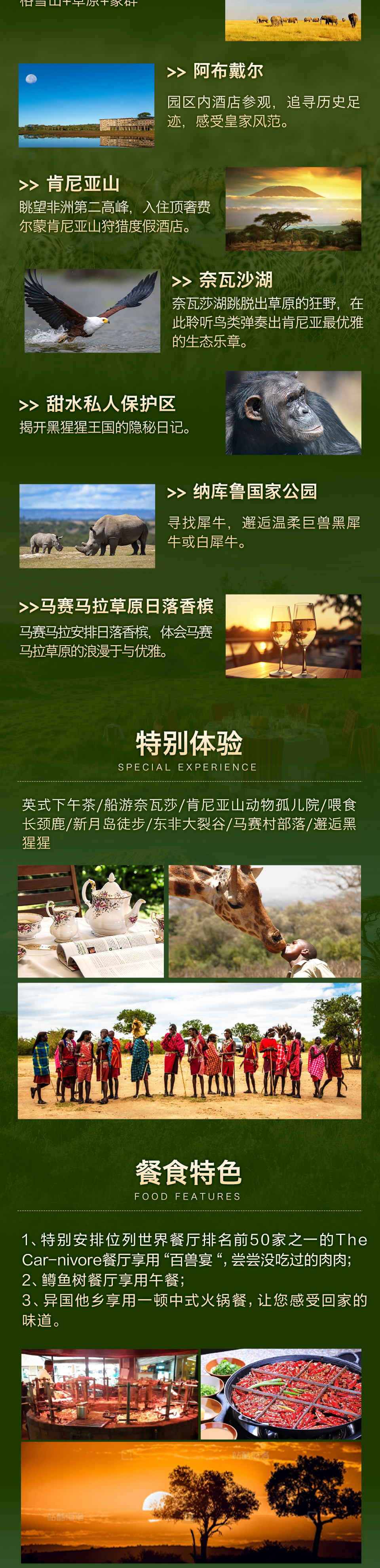 特别安排: 位列世界餐厅排名前50家之一的The Carnivore餐厅享用“百兽宴“,尝尝没吃过的肉肉; 鳟鱼树餐厅享用午餐;马赛马拉草原日落香槟,体会马赛马拉草原的浪漫于与优雅。 在异国他乡享用一顿中式火锅餐,让您感受回家的味道。