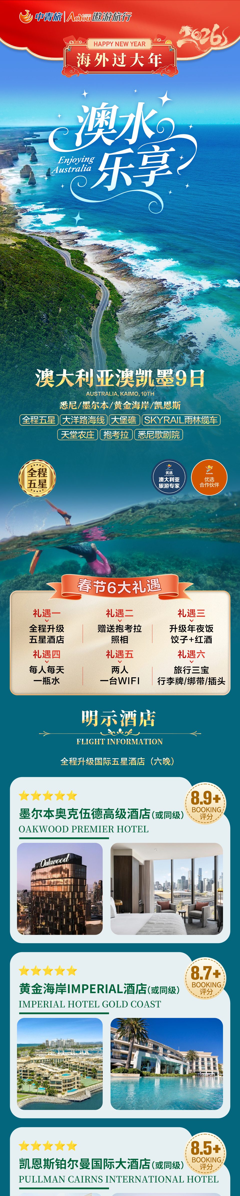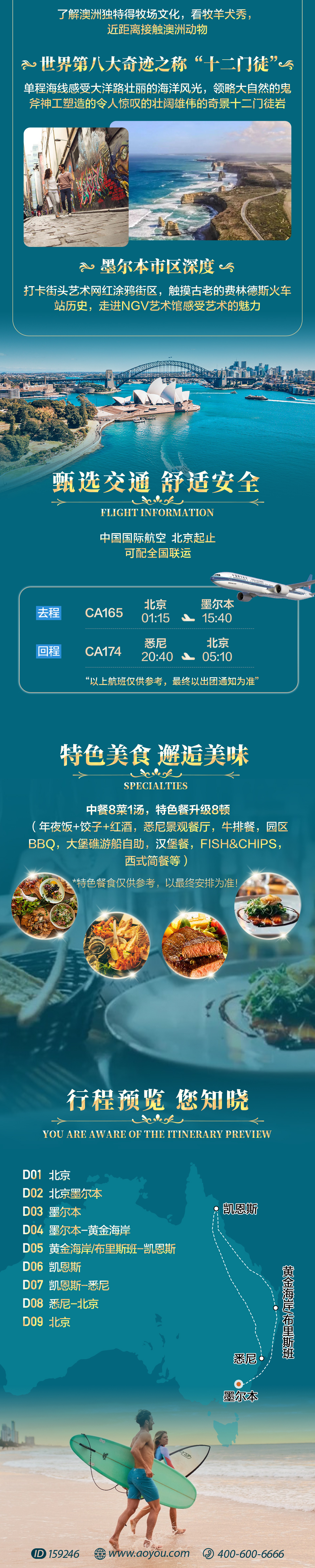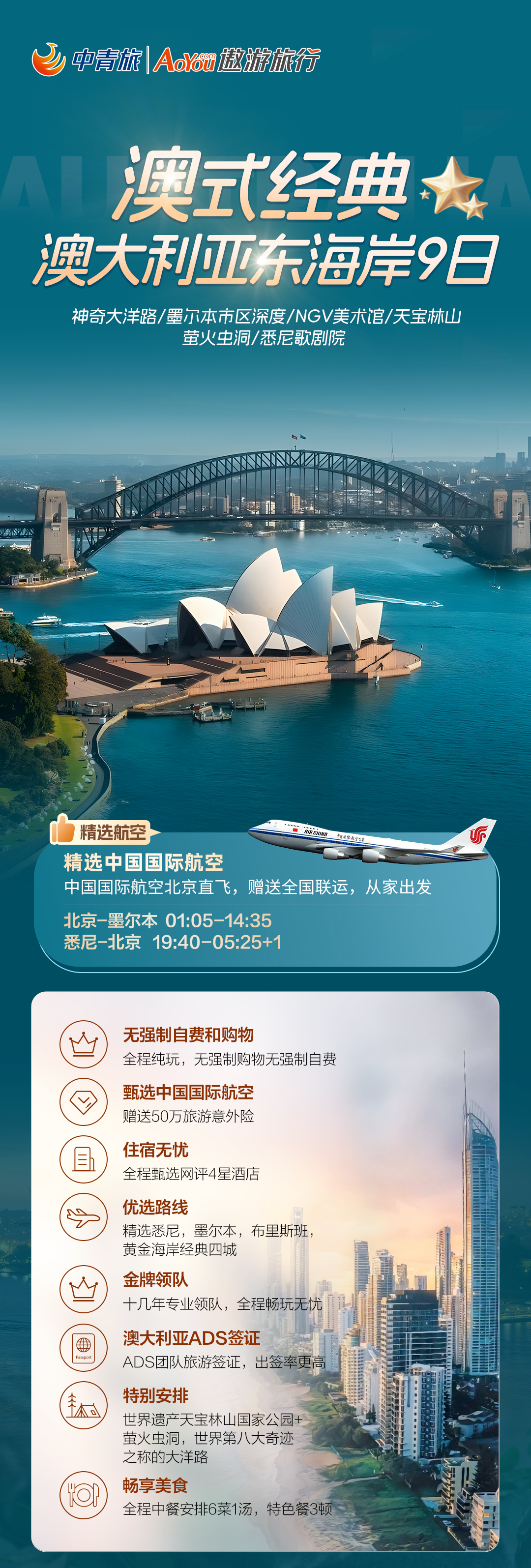 【澳水乐享】澳大利亚凯恩斯9-10日游【悉尼/墨尔本/凯恩斯/黄金海岸(不同线路有所差异)】 国航直飞/四星/四-五星酒店/6-8菜//中文领队/50万旅游意外险