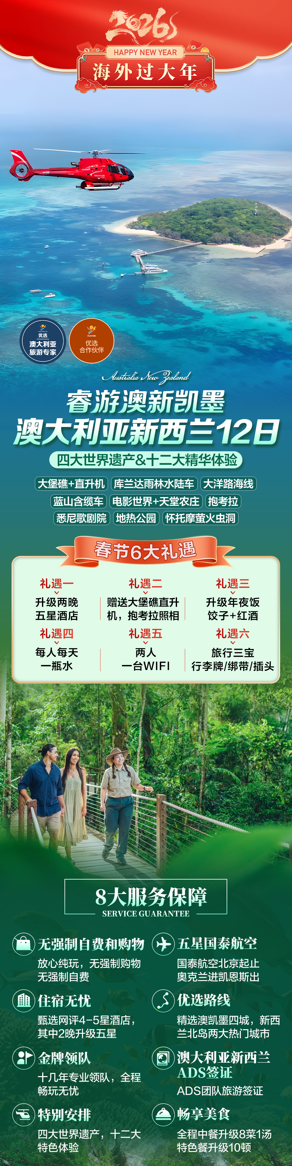 澳大利亚新西兰12日游【澳大利亚/新西兰北岛】 一价全含,中国航空,四-五星酒店,8菜1汤,中文领队(不同线路标准不同)