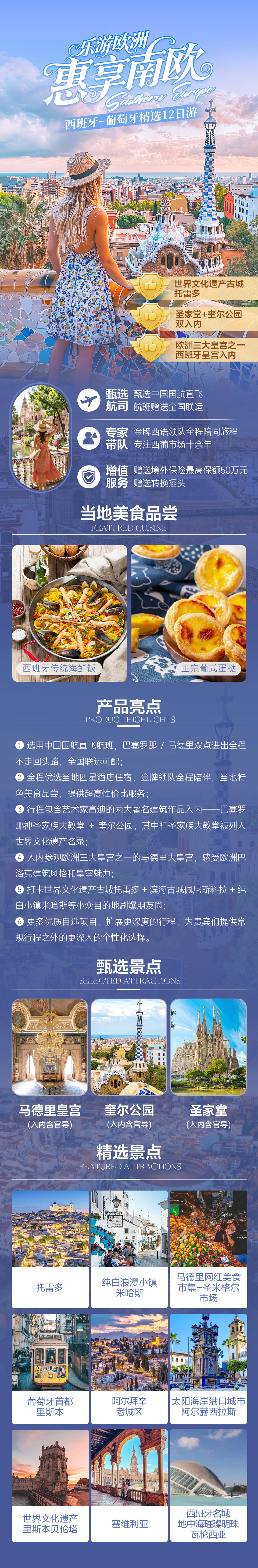 【乐游欧洲】惠享南欧-西班牙+葡萄牙精选11-12日游【马德里皇宫+圣家堂+世遗古城托雷多+纯白小镇+安达卢西亚+特色美食】