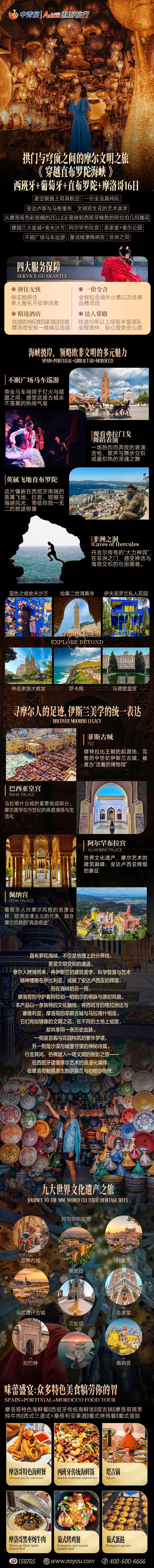 本产品以一条独特的文化轴线,将西班牙的阿尔罕布拉宫与塞维利亚,摩洛哥的菲斯古城与马拉喀什相连。它们宛如镜像的文明之花,在不同的土地上绽放,却共享同一条历史血脉。