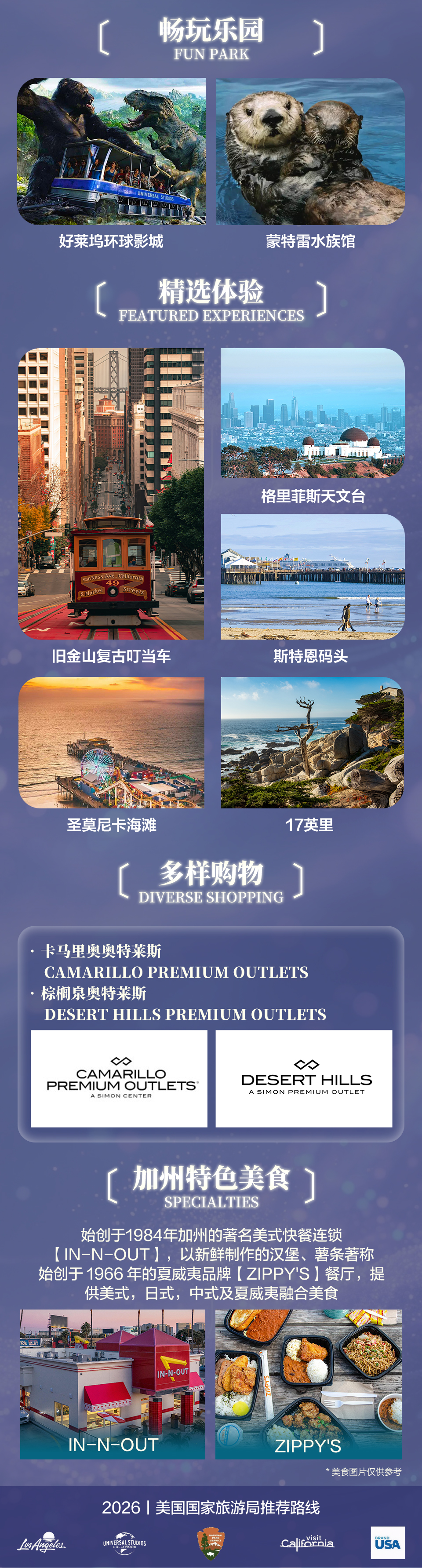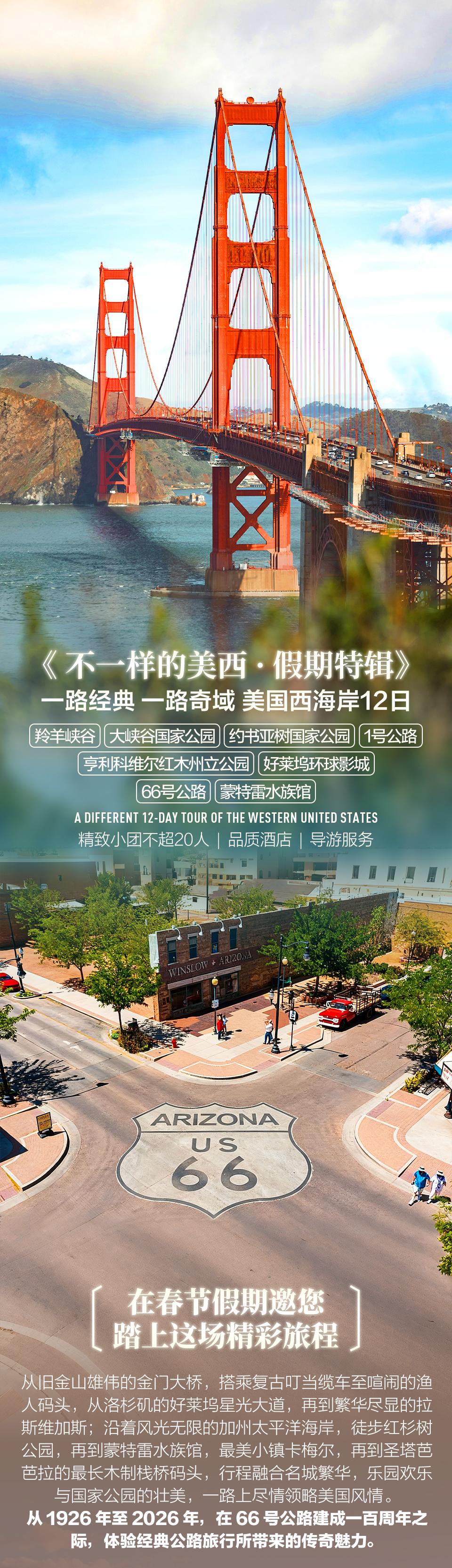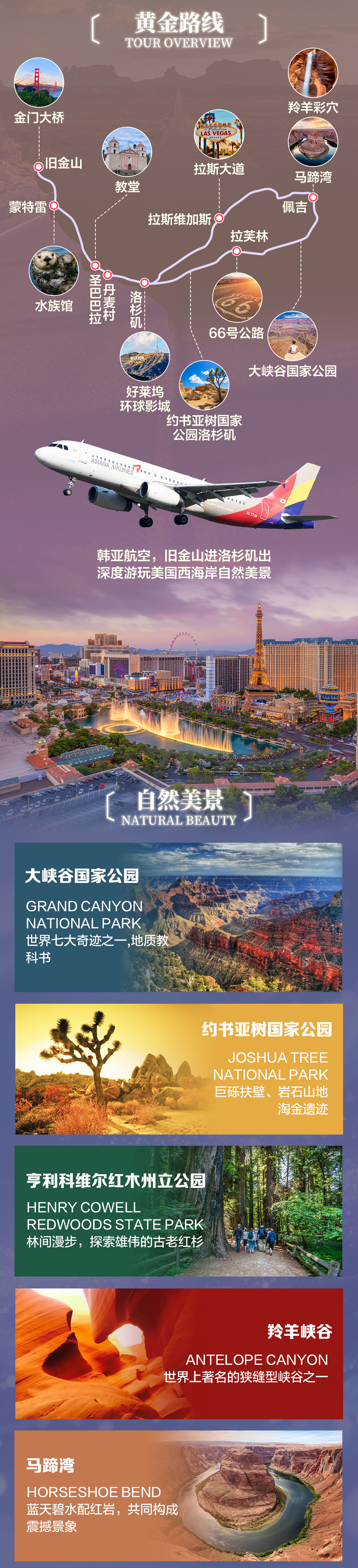亲爱的旅行者们,作为这款美国西海岸旅游产品的设计师,我满怀期待,邀您踏上这场精彩旅程。从旧金山雄伟的金门大桥,搭乘复古叮当缆车至喧闹的渔人码头,从洛杉矶的好莱坞星光大道,再到繁华尽显的拉斯维加斯;沿着风光无限的加州太平洋海岸,徒步红杉树公园,再到蒙特雷水族馆,最美小镇卡梅尔,再到圣塔芭芭拉的最长木制栈桥码头,行程融合名城繁华,乐园欢乐与国家公园的壮美,一路上尽情领略美国风情。