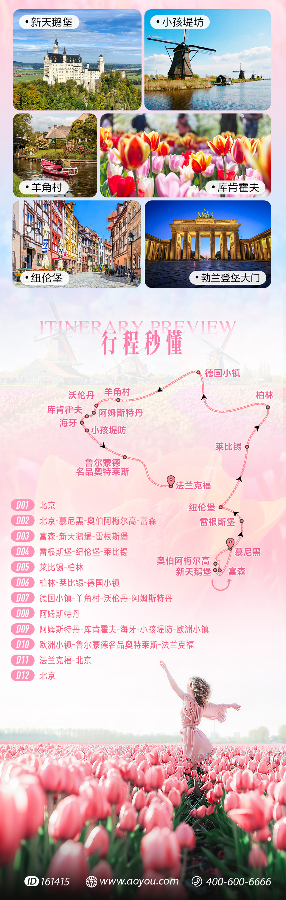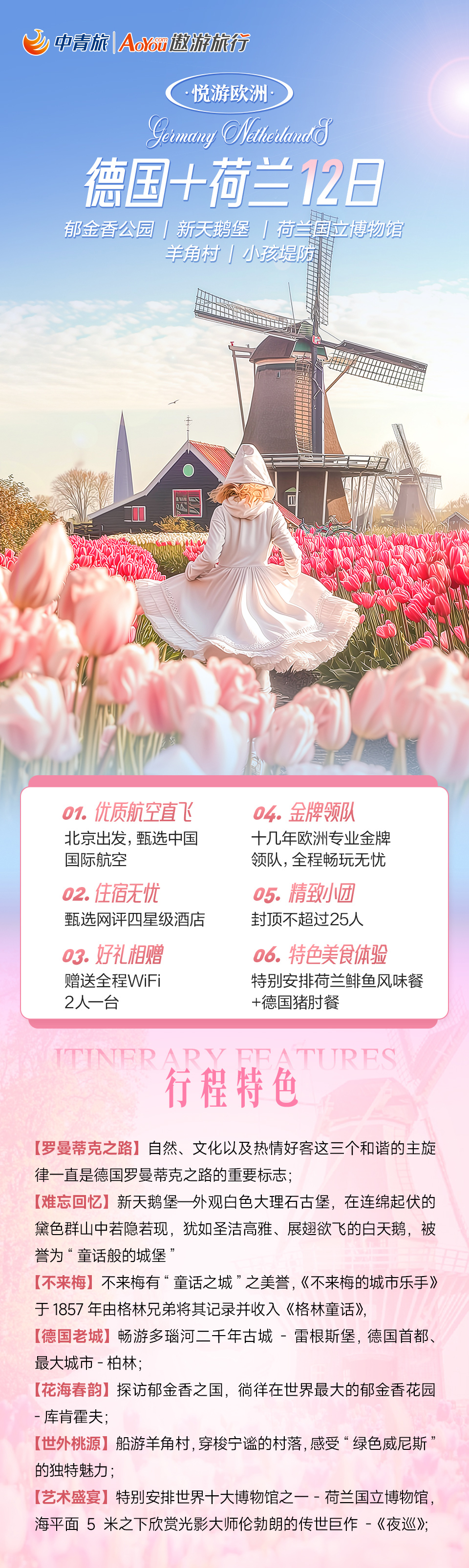 【悦游欧洲】【多彩花季】德国+荷兰一价全含12-13日游【郁金香公园+船游羊角村+新天鹅堡+莱茵河游船】 中文领队服务、赠送WIFI、赠送旅行三宝