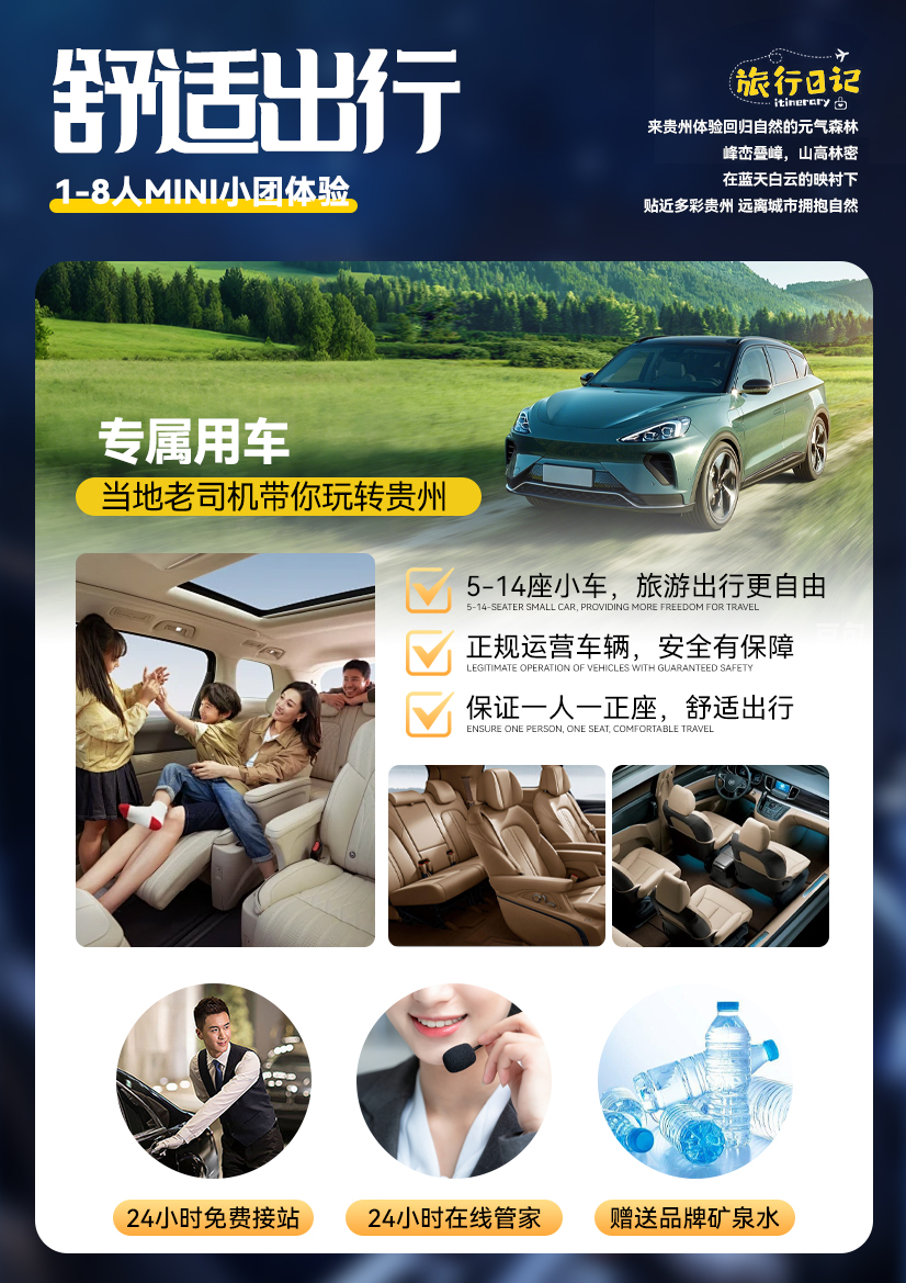 5. 贵州景区普遍较大,因团队中各家庭游览速度快慢不一,为避免影响贵宾行程体验,导游会在车上统一讲解,告知景区游览线路、主要特色、集合时间和地点,在关键的路口指引游览方向并执行部分讲解职能,进入景区后自由活动。