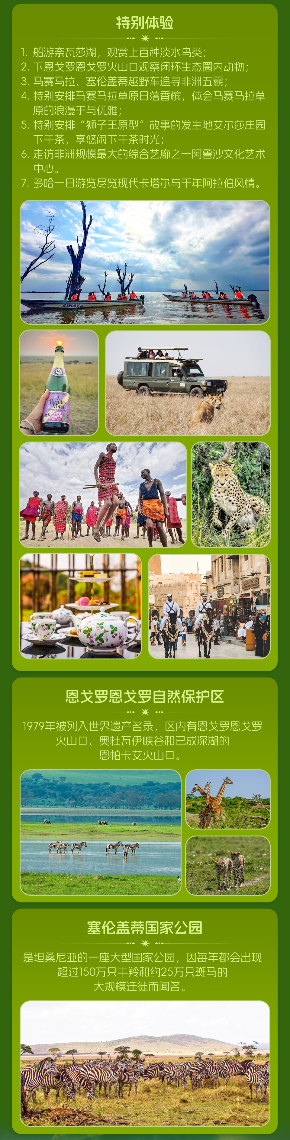 特别体验:船游奈瓦莎湖,观赏上百种淡水鸟类; 下恩戈罗恩戈罗火山口观察闭环生态圈内动物; 马赛马拉、塞伦盖蒂越野车追寻非洲五霸; 特别安排马赛马拉草原日落香槟,体会马赛马拉草原的浪漫于与优雅; 特别安排“狮子王原型”故事的发生地艾尔莎庄园下午茶,享悠闲下午茶时光; 走访非洲规模最大的综合艺廊之一阿鲁沙文化艺术中心。 多哈一日游览尽览现代卡塔尔与千年阿拉伯风情。