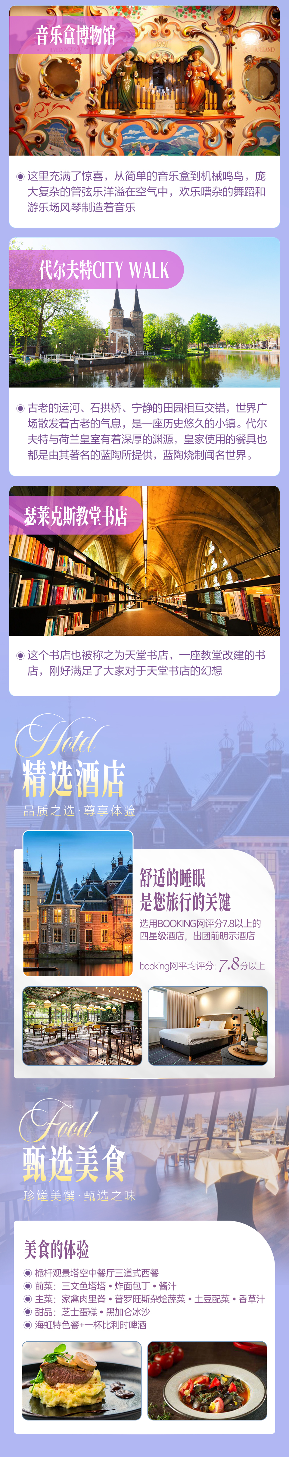 船游羊角村,穿梭宁谧的村落,感受“绿色威尼斯”的独特魅力; 骑行踏青梵高国家森林公园,游玩荷兰最大的自然保护区,走进库勒穆勒美术馆,《夜的咖啡馆》就收藏在里面。 体验乘坐荷兰中世纪蒸汽火车,用别样的方式欣赏荷兰独有的田园风光;
