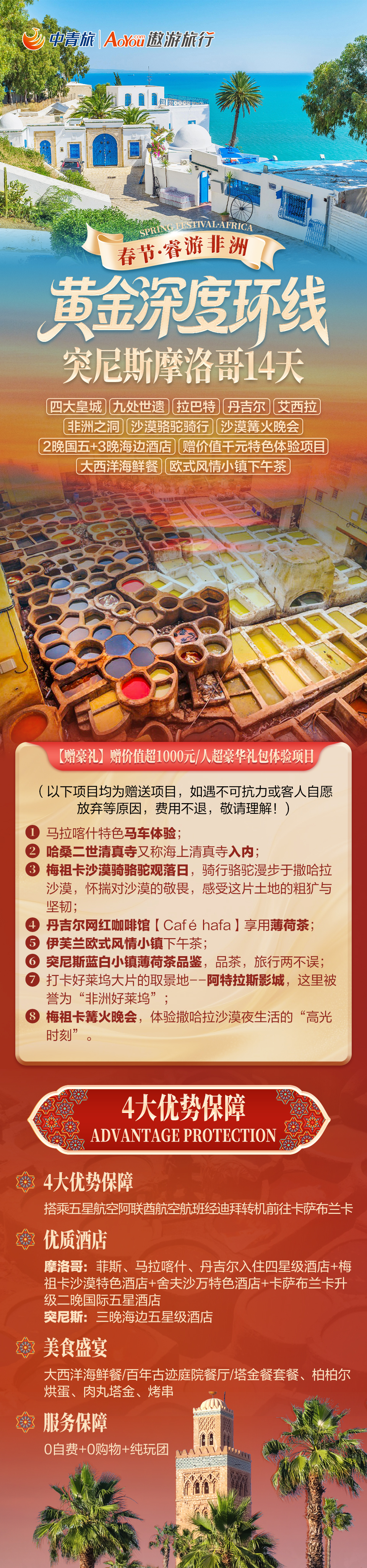 【赠豪礼】赠价值超1000元/人超豪华礼包体验: (以下项目均为赠送项目,如遇不可抗力或客人自愿放弃等原因,费用不退,敬请理解!) 马拉喀什特色马车体验;哈桑二世清真寺又称海上清真寺入内; 梅祖卡沙漠骑骆驼观落日,骑行骆驼漫步于撒哈拉沙漠,怀揣对沙漠的敬畏,感受这片土地的粗犷与坚韧; 丹吉尔网红咖啡馆【Café hafa】享用薄荷茶; 伊芙兰欧式风情小镇下午茶 突尼斯蓝白小镇薄荷茶品鉴,品茶,旅行两不误 打卡好莱坞大片的取景地--阿特拉斯影城,这里被誉为“非洲好莱坞”。 梅祖卡篝火晚会,体验撒哈拉沙漠夜生活的“高光时刻”。