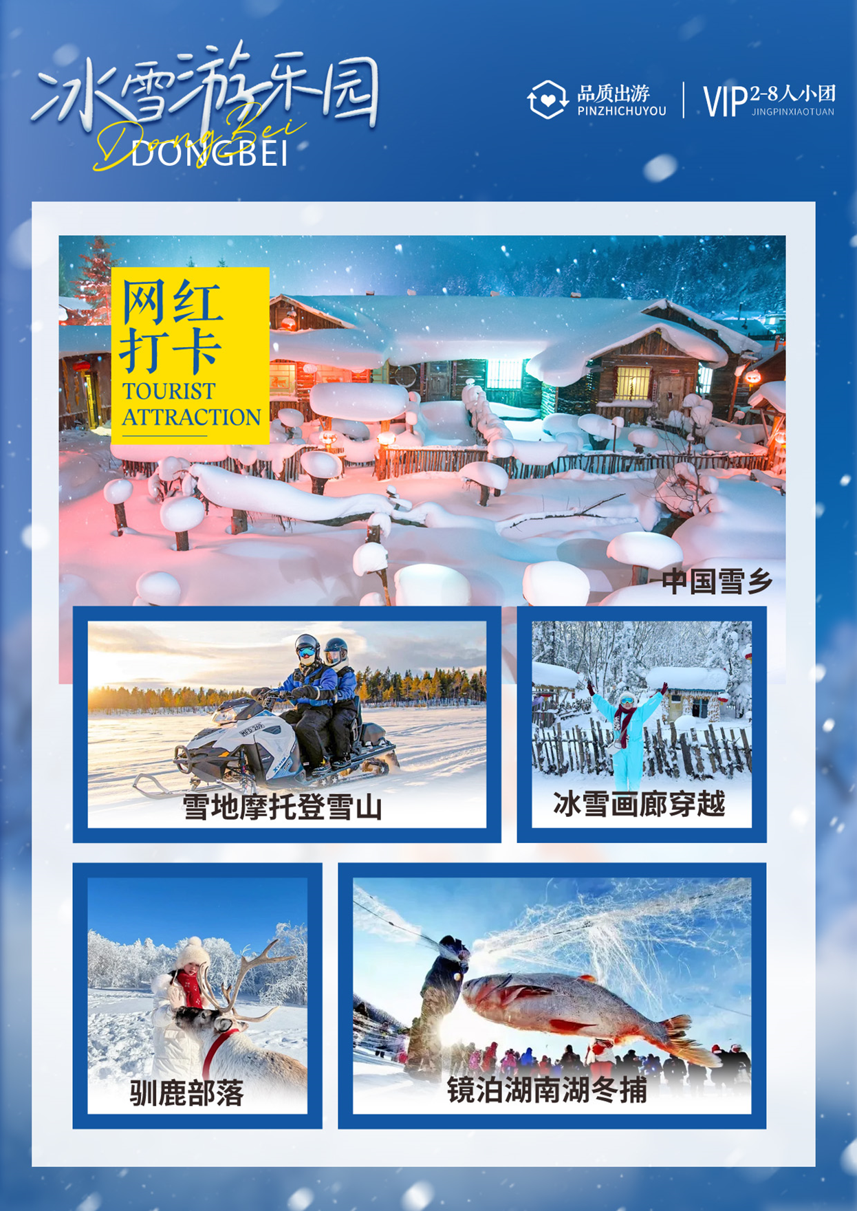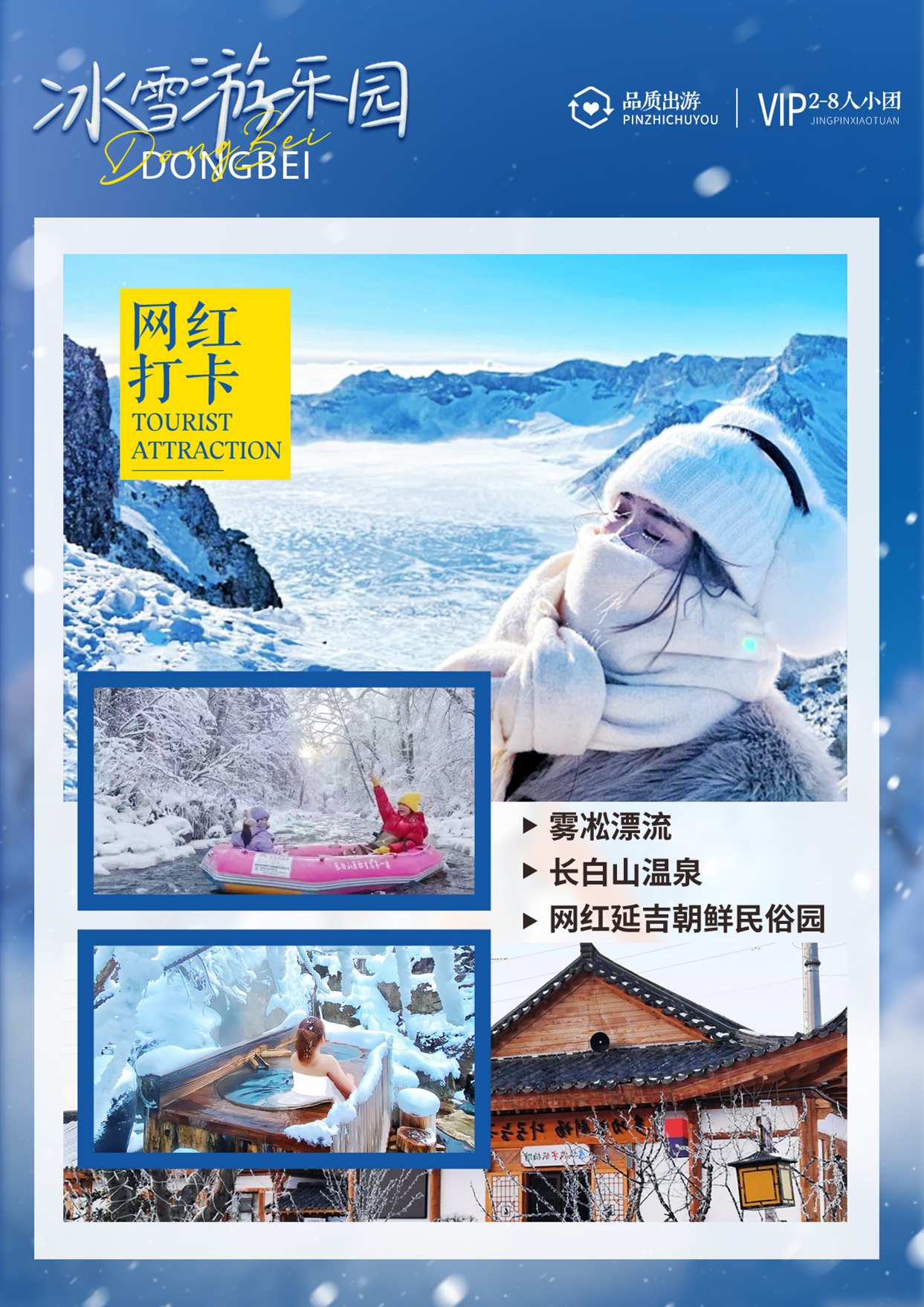 网红打卡: ▪长白山景区--冬季湖水冰封,那平静的冰面在蓝天的映衬下,依然美得让人窒息, ▪ 网红延吉朝鲜民俗园--青瓦白墙,古色古香,每一处细节都展现着朝鲜民族的传统文化魅力 ▪ 长白山温泉--银装素裹的世界,皑皑白雪与氤氲的温泉水汽相互交融,宛如梦幻之境, ▪ 雾凇漂流--穿梭于雾凇环绕的河面,感受“寒江雪柳,玉树琼花”的绝美意境, ▪ 中国雪乡--被冰雪雕琢的童话世界,层层叠叠的积雪在屋顶、树木上堆积,可爱又梦幻的雪蘑菇, ▪ 雪地摩托登雪山--驰骋在洁白无瑕的雪道上,感受风在耳边呼啸而过带你进入冰雪世界 ▪ 冰雪画廊穿越--漫步于冰雪画廊之中,脚下是嘎吱作响的积雪,仿佛是大自然演奏的独特乐章, ▪ 巴洛克老街区--欣赏风格独特的建筑群落,感受历史的沉淀与文化的交融, ▪ 驯鹿部落 --与温顺驯鹿亲密互动,感受人与自然和谐共生的奇妙体验, ▪ 网红大雪人--打卡巨型可爱雪人景观,矗立在城市街角成为冬日标志性风景, ▪ 百年老街中央大街--两旁矗立着风格各异的欧式建筑,仿佛置身于欧洲小镇, ▪ 圣索菲亚教堂广场--拜占庭式建筑风格,绿顶红墙在白雪映衬下更显韵味, ▪ 激情滑雪--体验雪地上的速度与激情一万科松花湖国际滑雪度假区! ▪ 镜泊湖南湖冬捕-- 凿开厚厚的冰层,撒下大网,静静等待收获的时刻。 ▪ 冰雪大世界--璀璨冰雪王国,汇聚全球顶尖冰雪艺术,巨型冰雕建筑群令人叹为观止