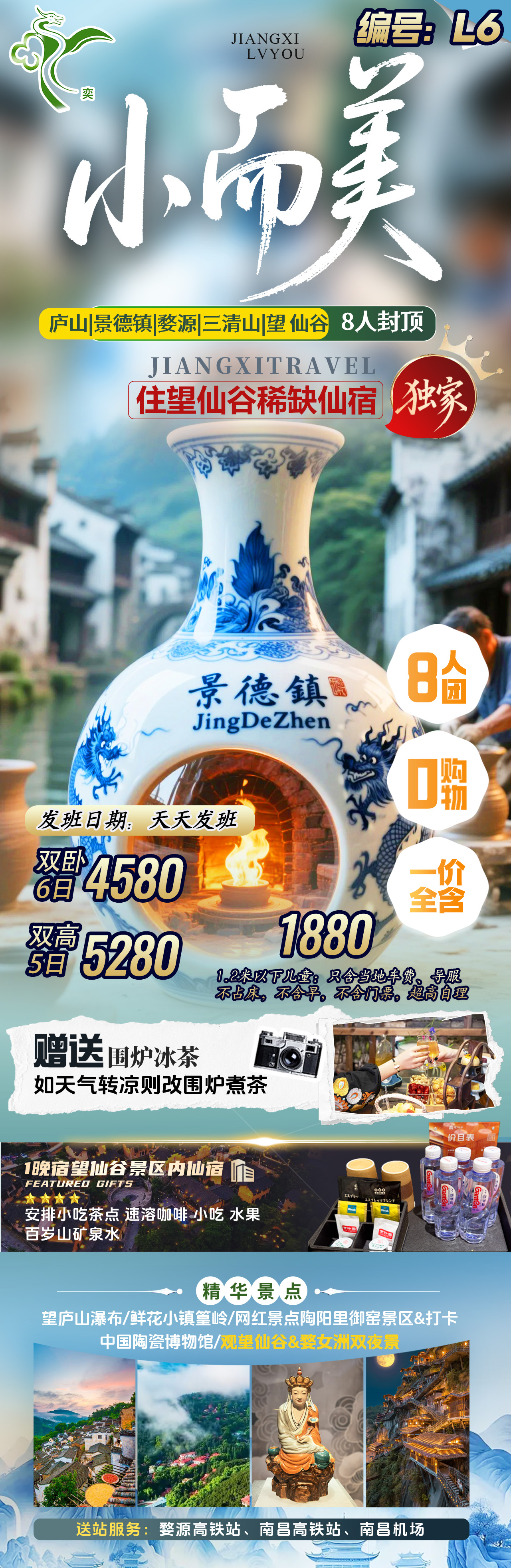 【江西】庐景婺三望双卧6日/双高/5日【南昌+庐山+中国陶瓷博物馆+望仙谷+三清山+篁岭】 【庐景婺三望】|2-8人小团|南昌进出|全程4钻+2晚景区内|纯玩无购物