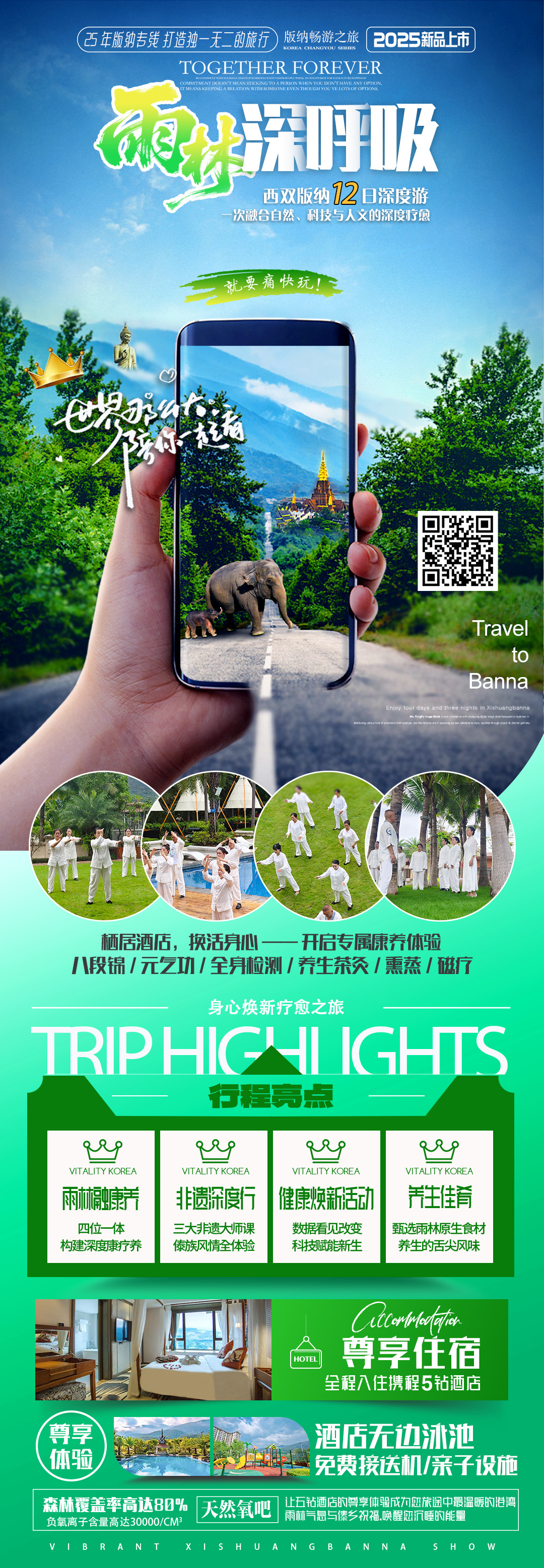 · 其他:最佳出行时间:9月至次年5月,气温适宜,雨量较少,是游览西双版纳的最佳季节。着装建议:轻便透气衣物,舒适防滑鞋,防晒帽和墨镜,一件薄外套应对早晚温差。 必备物品:防晒霜、驱蚊液、防水手机袋、相机、舒适的徒步鞋、水壶、轻便雨具。 文化礼仪:尊重当地少数民族风俗习惯,泼水时避免向老人、婴儿和孕妇泼水,被泼水时要微笑接受,这是祝福的象征。 旅行保险:建议购买涵盖医疗、意外和行李丢失的旅行保险,保障您的旅途安全。 在这场西双版纳五钻酒店焕醒初体验之旅中,您将收获的不仅是身体的健康焕新, 更是心灵的深度疗愈与文化的沉浸式体验。从无边泳池到孔雀餐再到星空温泉,从雨林漫步到野象谷互动,每一处细节都精心设计,只为给您带来最完美的版纳之旅。 当北纬21。的星光再次洒落, 您将带着满身的雨林气息、傣乡祝福和健康能量,踏上归途。这份来自西双版纳的馈赠,将成为您旅途中最珍贵的记忆,也是生活中最美好的能量来源。让我们再次相约版纳。
