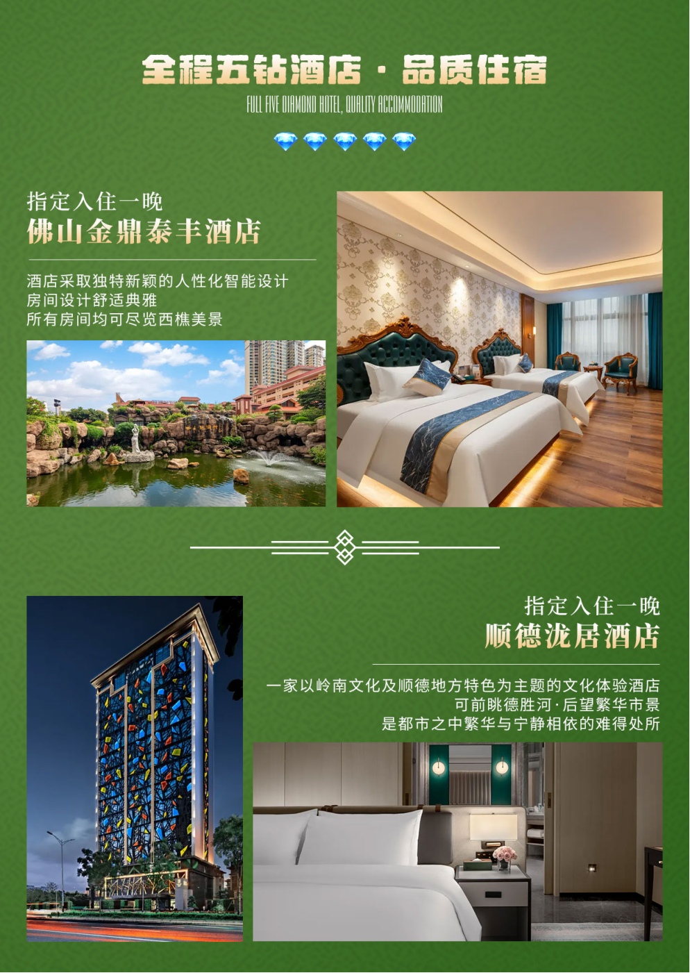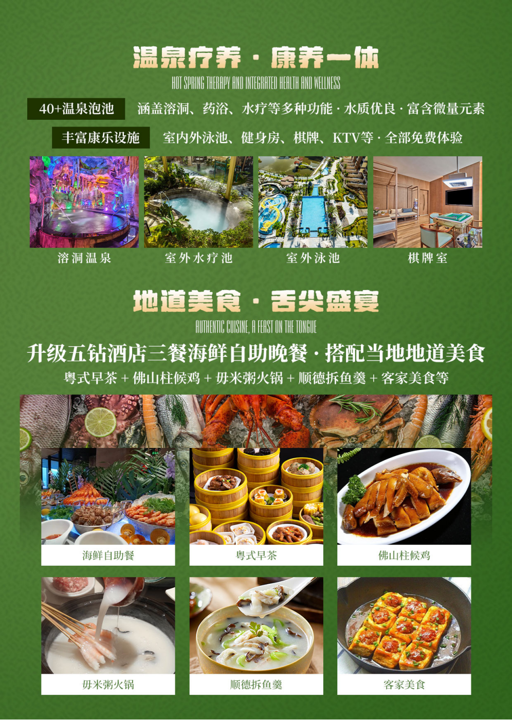 升级三餐五钻酒店豪华自助海鲜晚餐,并穿插地道的老广风味、佛山柱候鸡、毋米粥火锅、顺德拆鱼羹、白水寨农家菜、万绿湖客家美食等。