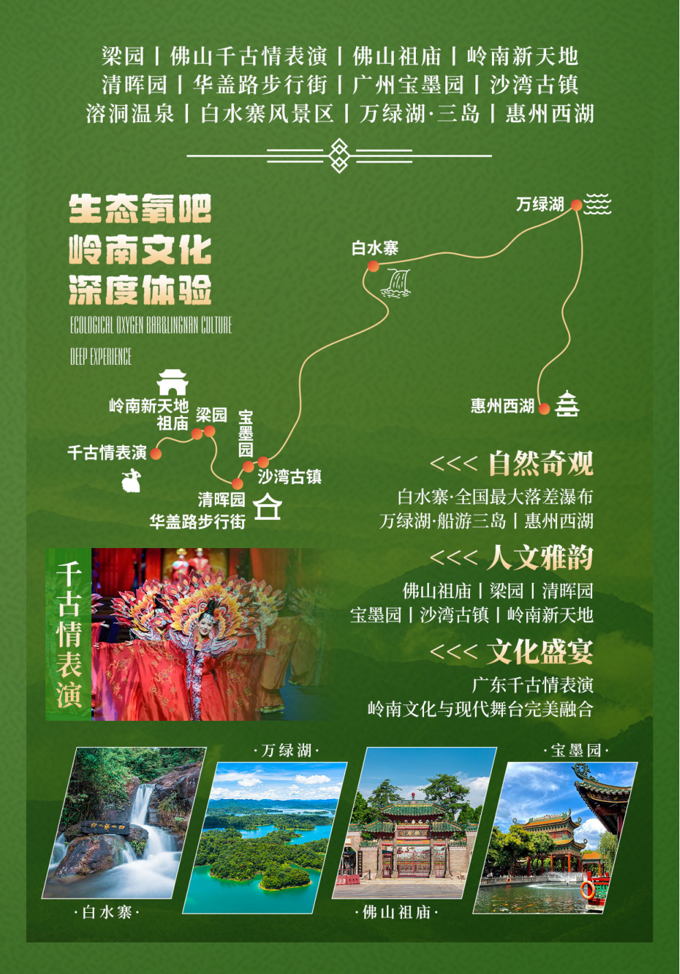 山野奇观: 白水寨(内地落差最大瀑布)、万绿湖(船游湖光山色)。