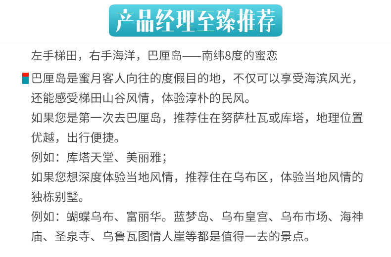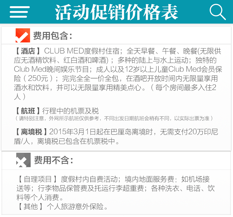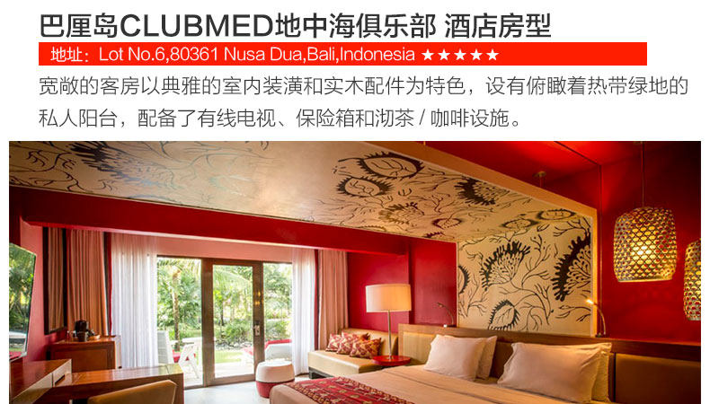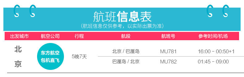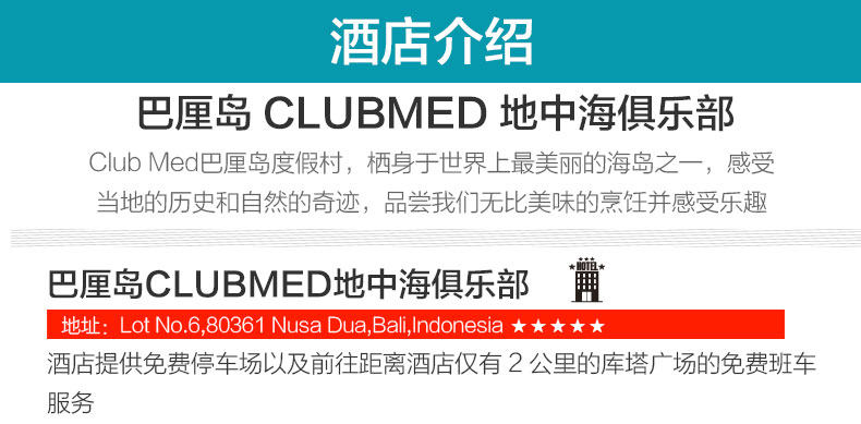 酒店入住退房时间和床型:根据国际惯例,巴厘岛酒店入住时间为下午14:00-15:00,退房时间为上午10:00-12:00,请您在入住时与前台确认该酒店的退房时间,以免忘记退房发生额外费用。如果您的航班是晚航班,酒店允许付费延迟退房,具体费用请咨询酒店前台,中青旅一般不为客人提供零时延迟退房的业务。酒店的床型仅备注申请,不能保证,以酒店入住为准。时差提醒:巴厘岛与北京无时差;雅加达、日惹比北京晚1个小时;所有航班时刻均为当地时间。入境提示:中国游客到印度尼西亚可办理落地签。抵达机场后,凭有效护照和往返机票在visa on arrival窗口即可办理,停留30天,费用25美元/人。请勿在海关和移民署随意拍照、打电话,以免海关罚款。请您携带本人护照原件办理出入境手续,并保证护照有效期在结束旅游行程后返回出发地日期半年以上有效。出入境管理处通知,为确保您顺利出行,请在护照“注意事项”页(封底)持照人签名处签署本人姓名。否则北京及各国家边防机关有权拒绝您出境或入境。如果您和家人持国外证件,在自行核实印度尼西亚签证的同时,请务必确认持有返回中国的签证,以防到达北京时无法入境。服务费提示:一般床头服务费、行李生服务费约1-2美金,自由行导游服务费一般为10美金/人/天。货币提示:出境人员携出金额在等值5000美元以内(含5000美元)的,不需申领《携带证》,海关予以放行。当天多次往返及短期内多次往返者除外。巴厘岛当地货币为印尼盾(Rupiah,简写为RP)。目前1元人民币相当于1800盾左右,1美元相当于11000盾左右,确认汇率请在出行前查询。在巴厘岛,一般住宿、包车、旅行社游览项目多以美元报价,而购物、吃饭、付服务费则多使用印尼盾。巴厘岛当地兑换印尼盾很容易,大街上随处可见MONEY CHANGE,不过每家的兑换汇率会略有出入,不妨多走几家比较一下。巴厘岛正规商店和饭店一般都可以使用信用卡,所以建议您带一张VISA或MASATER的信用卡。此外,银联卡在一些大型商场都可以使用,请您在付款时让结算人员选择银联结算通道即可,相比较而言,使用银联卡会比较划算。用电规格: 220V,两孔圆形插头(德标)保险提示:建议您出行前购买旅游意外险,可根据出境天数自行在保险公司购买,也可由我社代买。自由行无导游无领队,请您自行办理登机手续和入住手续,妥善安排度假行程。夜航提示:如果乘坐夜航,请您出发前务必看清出发日期和时间以及需要到达机场的日期和时间,以免发生误机。巴厘岛电话卡的配送:巴厘岛电话卡统一由当地接机人员发放!巴厘岛电话卡使用说明:电话卡无需激活可直接使用。卡的大小地接接机时可以帮忙剪卡(卡内余额大约可拨打当地电话5分钟左右,可自行充值)。