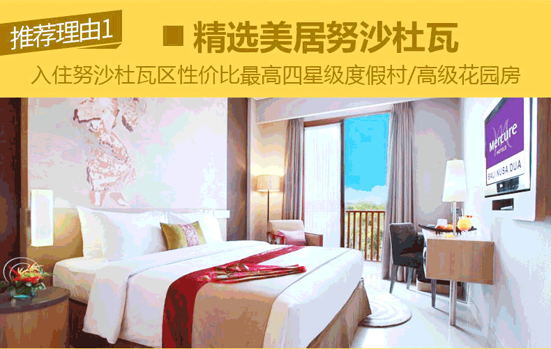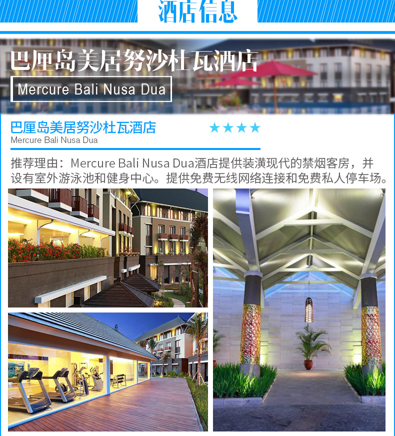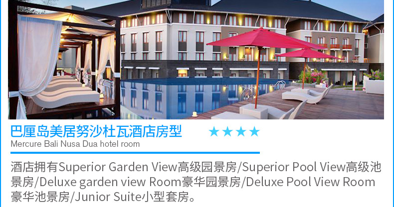 住宿 努萨杜瓦美居Mercure酒店隶属于法国雅高酒店集团,5晚基础房。酒店位置便捷,距离库塔海滩、DFS距离仅约2公里,酒店提供免费WIFI