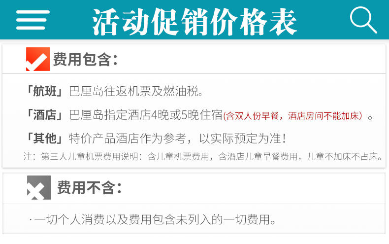酒店入住退房时间和床型:根据国际惯例,巴厘岛酒店入住时间为下午14:00-15:00,退房时间为上午10:00-12:00,请您在入住时与前台确认该酒店的退房时间,以免忘记退房发生额外费用。如果您的航班是晚航班,酒店允许付费延迟退房,具体费用请咨询酒店前台,中青旅一般不为客人提供零时延迟退房的业务。酒店的床型仅备注申请,不能保证,以酒店入住为准。时差提醒:巴厘岛与北京无时差;雅加达、日惹比北京晚1个小时;所有航班时刻均为当地时间。入境提示:中国游客到印度尼西亚可办理落地签。抵达机场后,凭有效护照和往返机票在visa on arrival窗口即可办理,停留30天,费用25美元/人。请勿在海关和移民署随意拍照、打电话,以免海关罚款。请您携带本人护照原件办理出入境手续,并保证护照有效期在结束旅游行程后返回出发地日期半年以上有效。出入境管理处通知,为确保您顺利出行,请在护照“注意事项”页(封底)持照人签名处签署本人姓名。否则北京及各国家边防机关有权拒绝您出境或入境。如果您和家人持国外证件,在自行核实印度尼西亚签证的同时,请务必确认持有返回中国的签证,以防到达北京时无法入境。服务费提示:一般床头服务费、行李生服务费约1-2美金,自由行导游服务费一般为10美金/人/天。货币提示:出境人员携出金额在等值5000美元以内(含5000美元)的,不需申领《携带证》,海关予以放行。当天多次往返及短期内多次往返者除外。巴厘岛当地货币为印尼盾(Rupiah,简写为RP)。目前1元人民币相当于1800盾左右,1美元相当于11000盾左右,确认汇率请在出行前查询。在巴厘岛,一般住宿、包车、旅行社游览项目多以美元报价,而购物、吃饭、付服务费则多使用印尼盾。巴厘岛当地兑换印尼盾很容易,大街上随处可见MONEY CHANGE,不过每家的兑换汇率会略有出入,不妨多走几家比较一下。巴厘岛正规商店和饭店一般都可以使用信用卡,所以建议您带一张VISA或MASATER的信用卡。此外,银联卡在一些大型商场都可以使用,请您在付款时让结算人员选择银联结算通道即可,相比较而言,使用银联卡会比较划算。用电规格: 220V,两孔圆形插头(德标)保险提示:建议您出行前购买旅游意外险,可根据出境天数自行在保险公司购买,也可由我社代买。自由行无导游无领队,请您自行办理登机手续和入住手续,妥善安排度假行程。夜航提示:如果乘坐夜航,请您出发前务必看清出发日期和时间以及需要到达机场的日期和时间,以免发生误机。巴厘岛电话卡的配送:巴厘岛电话卡统一由当地接机人员发放!巴厘岛电话卡使用说明:电话卡无需激活可直接使用。卡的大小地接接机时可以帮忙剪卡(卡内余额大约可拨打当地电话5分钟左右,可自行充值)。
