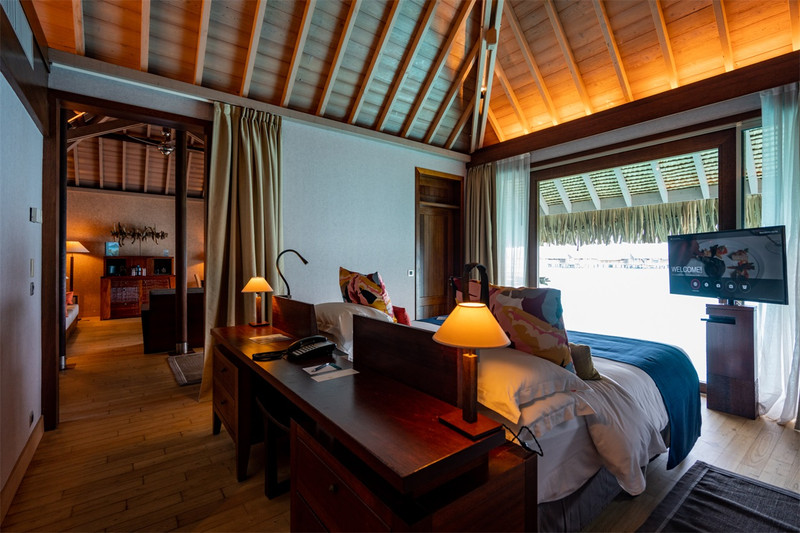 康莱德 波拉波拉岛 酒店的总统套房是整个 波拉波拉岛 最奢华的房间,也是陈思成和佟丽娅大婚时住的套房,这里有 波拉波拉岛 唯一的双层水屋,将你能想象的豪华别墅完整的搬到海面。一晚约十万人民币!