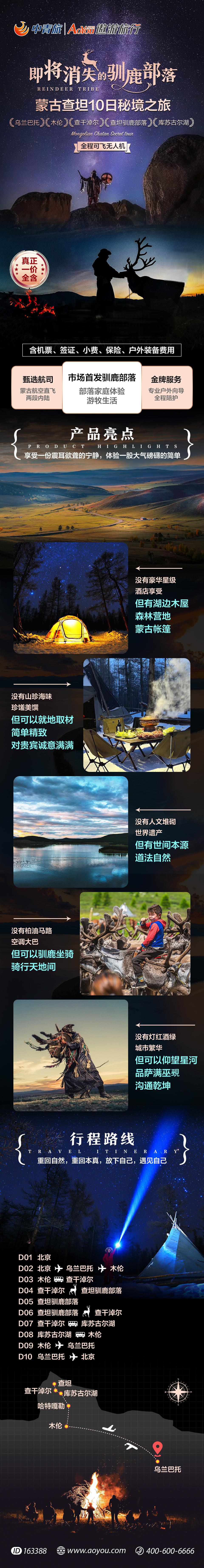 1.寂静唯美之旅:蒙古北方重镇--木伦小镇;圣洁的湖泊--查干淖尔;最后的游牧民族—查坦驯鹿部落;洗涤心灵的圣湖---蒙古第一大湖:库苏古尔湖;山顶俯瞰乌兰巴托之夜。