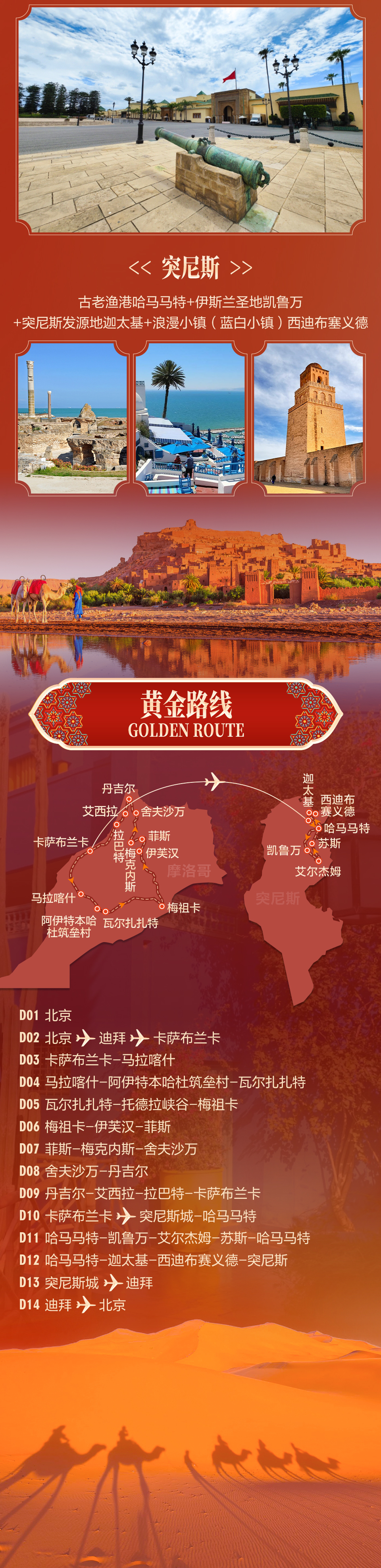【景点升级】 摩洛哥:遍访四大皇城+九处世遗界文化遗产+沙漠腹地梅祖卡+大片取景地瓦尔扎扎特 网红拍照地蓝白小镇舍夫沙万+摩洛哥小瑞士伊芙汉+北非谍影之城-卡萨布兰卡 海滨山城丹吉尔+粉红之城艾西拉 红色皇城-马拉喀什:伊夫圣洛朗私人花园、巴西亚皇宫、库图比亚清真寺、不眠广场 黑色皇城-梅克内斯:曼索尔城门( Bab Mansour) 蓝色皇城-菲斯:古兰经经学院、Nejjarine 泉、伊德里斯陵墓、卡拉维因大学、布日卢蓝门 白色皇城-拉巴特:见证千年历史的年轻首都 突尼斯:古老渔港哈马马特+伊斯兰圣地凯鲁万+突尼斯发源地迦太基 +浪漫小镇(蓝白小镇)西迪布塞义德