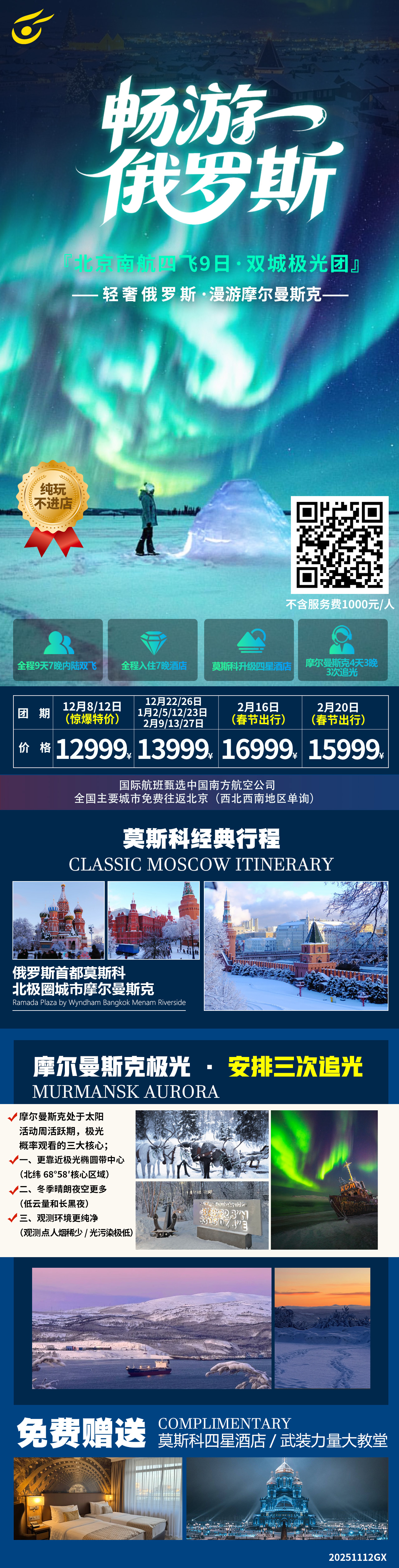 【欧洲】俄罗斯 莫斯科+摩尔曼斯克 9日游【红场及周边|爱国者公园|武装力量大教堂|捷里别尔卡|萨米民俗村|3次追极光】 南方航空|北京直飞|纯玩无购物|免费全国联运