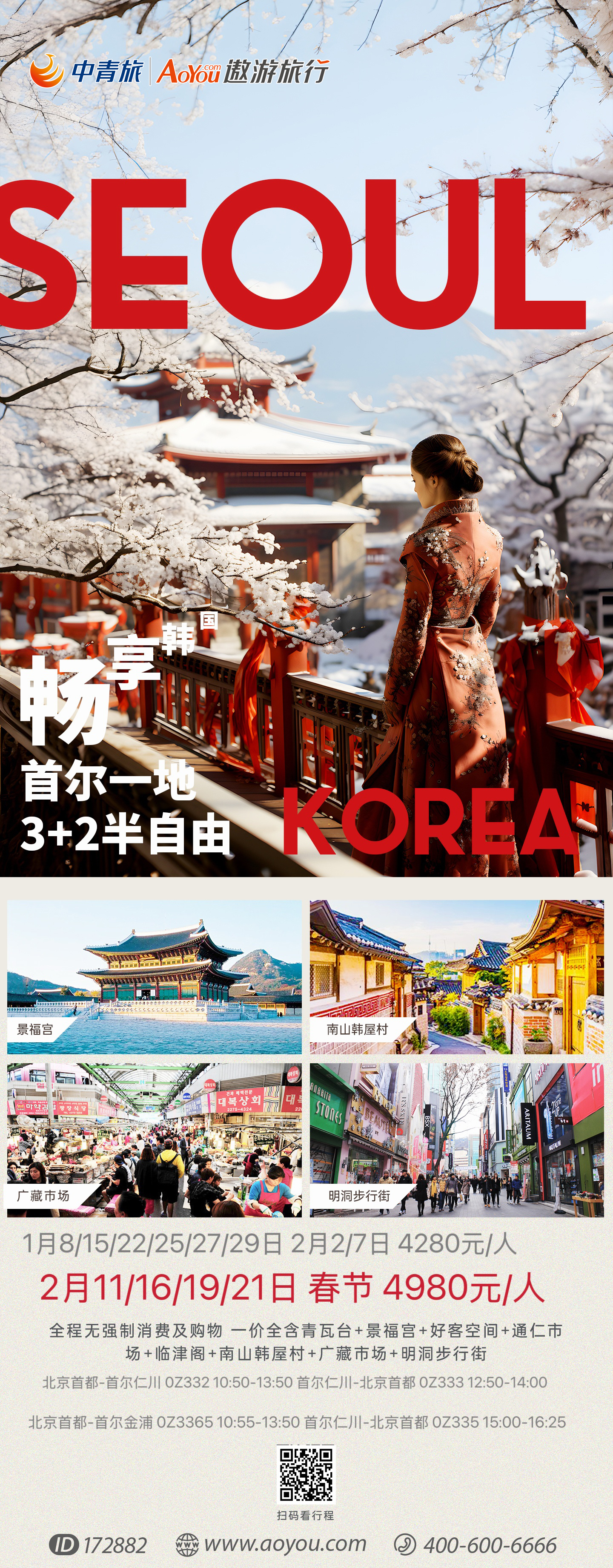 韩国首尔一地 3+2 半自助5日游 首尔2天自由活动