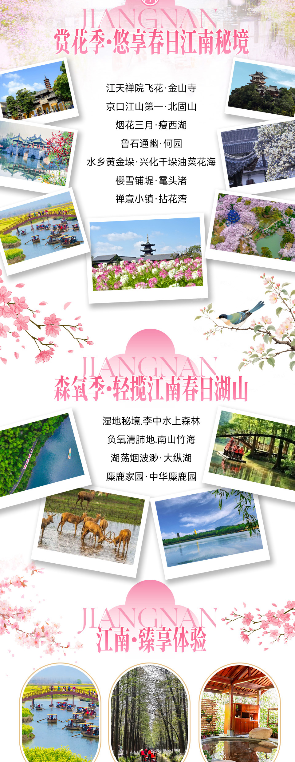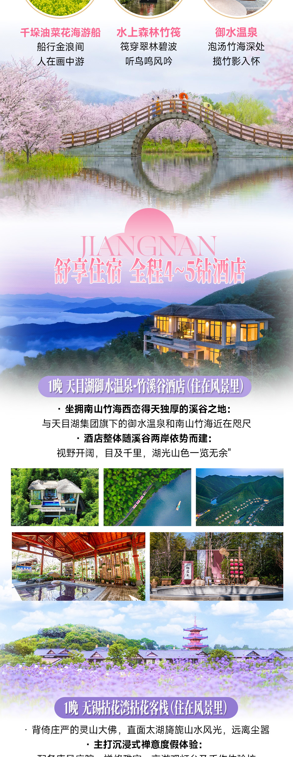 太湖缀明珠 “无锡”:鼋头渚 — 樱雪铺堤,碧波映霞,渚头揽春,清芬漫染晴川;拈花湾 — 禅灯摇影,曲巷藏春,花径通幽,静韵萦回古村;