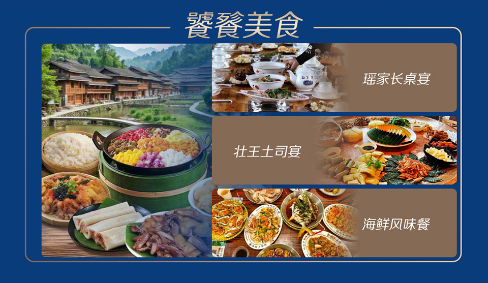 瑶家养生餐、瑶家长桌宴、壮王土司宴、海鲜风味餐
